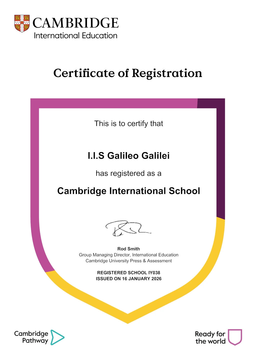 A partire dall'a.s.2026/2027 sarà attiva la sezione "CAMBRIDGE" del Liceo delle Scienze Applicate, riconosciuta dal Cambridge International Education. Il quadro orario sarà comune alle altre sezioni, ma le discipline di Geografia, Scienze naturali e Inglese saranno svolte completamente in inglese sulla base del syllabus per il conseguimento del IGCSE.